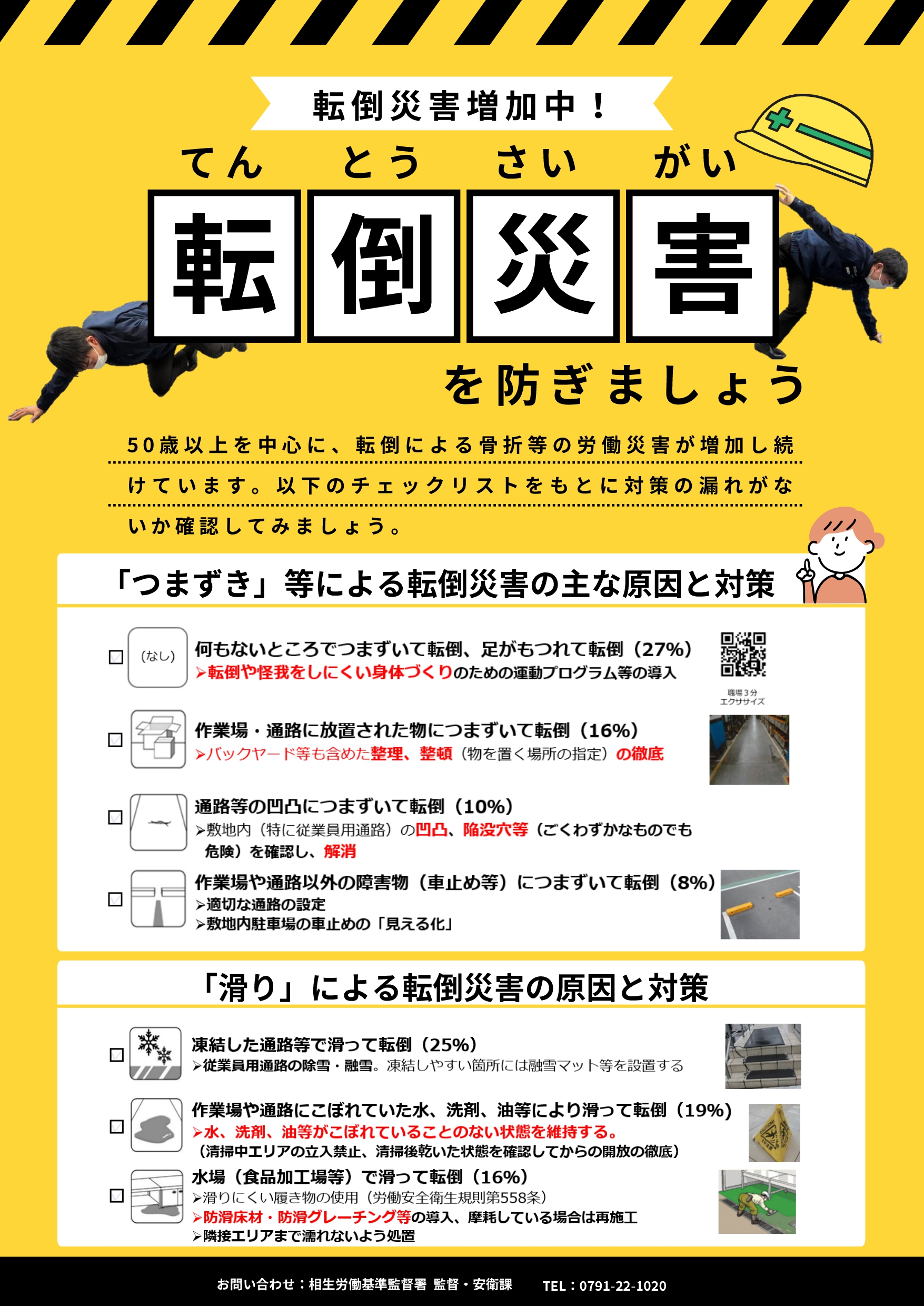 相生署管内(相生市・赤穂市・上郡郡・佐用郡)では、去年度と比較すると、特に転倒災害が急増しております。今後ますます気温が低下していきますと、滑り等による転倒災害がさらに増加することが懸念されます。